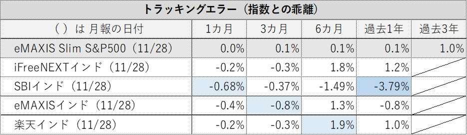 トラッキングエラー(指数との乖離)は、参考として「eMAXIS Slim S&P500」を入れ比較しました
