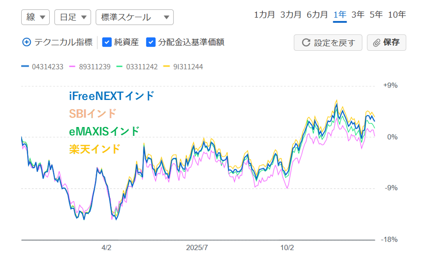 誤差レベルですが「iFreeNEXTインド」と「楽天インド」が、いい感じてす