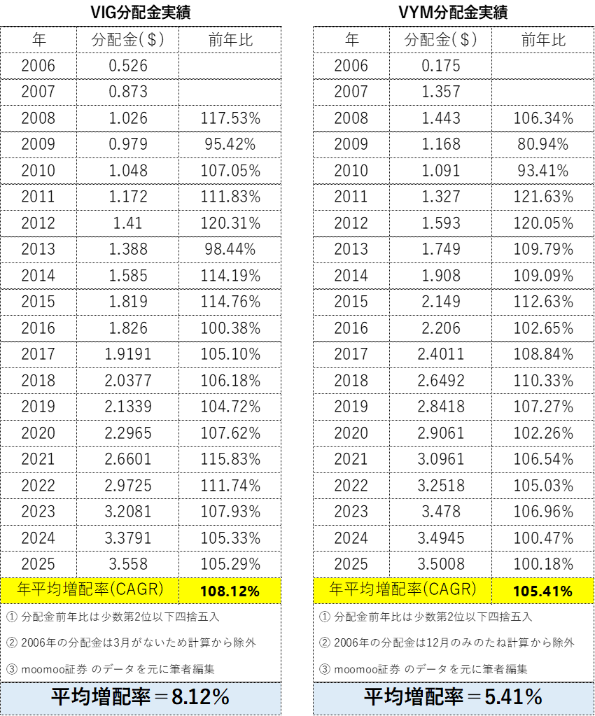算出のデータは、2025年末時点までの「VIG」「VYM」の分配金実績と
