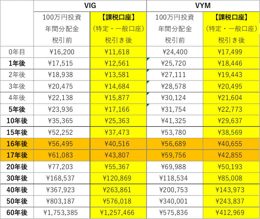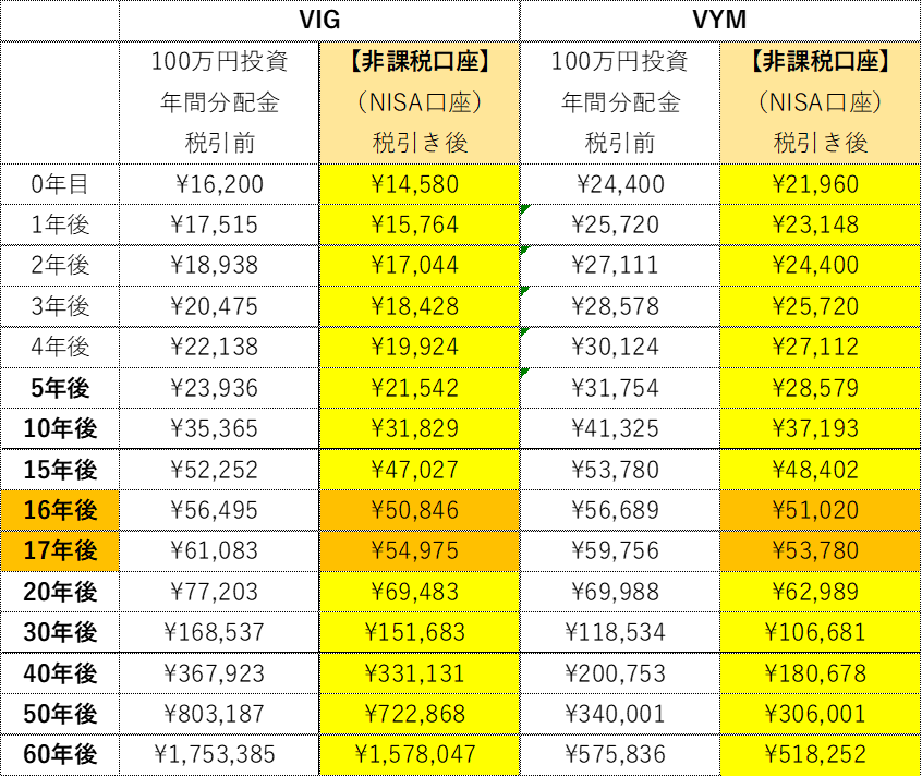 年間の、分配金の受取予想額は、以下の表の通り、17年後、年間の受取金額は逆転し「VYM」より「VIG」の方が多くなります