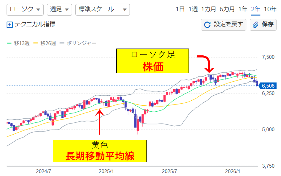 ・黄色の線が「長期移動平均線」
