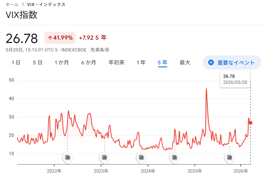 VIX指数 | Google Finance より転用(2026.3.23)