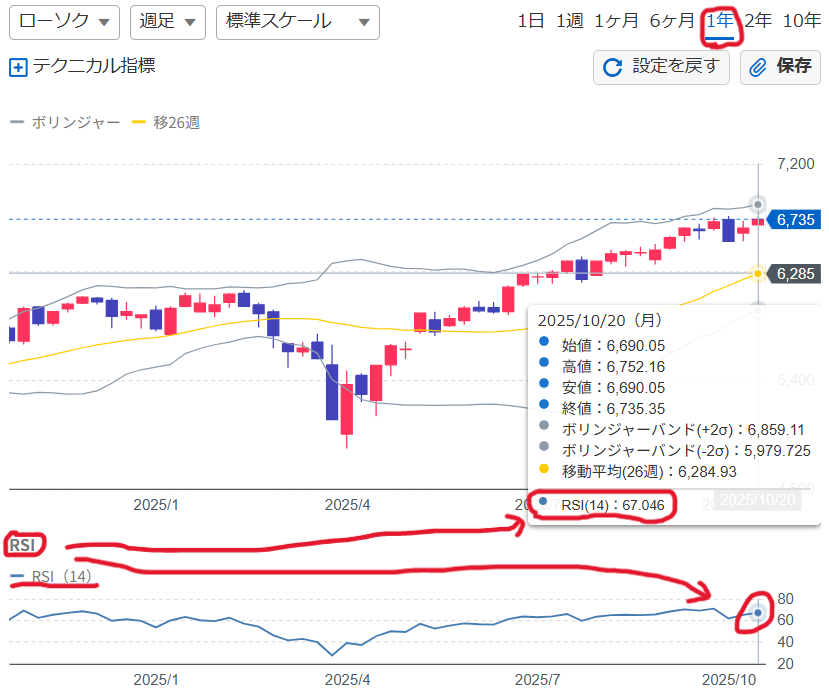 RSIは、現状「約67」で、買われ過ぎ気味です