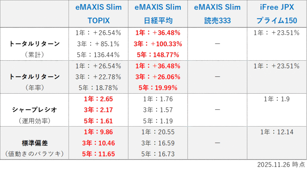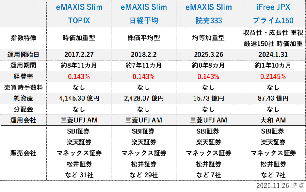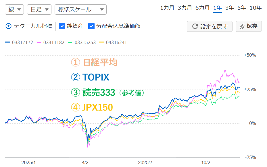 「読売333」と「JPX150」は、運用期間が短いため