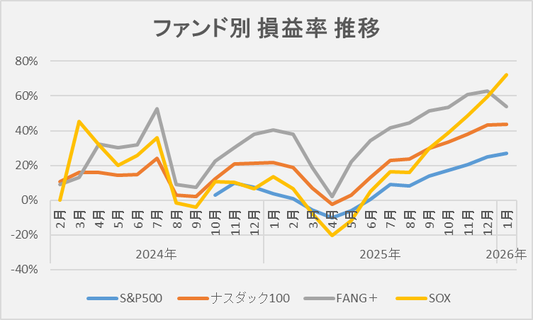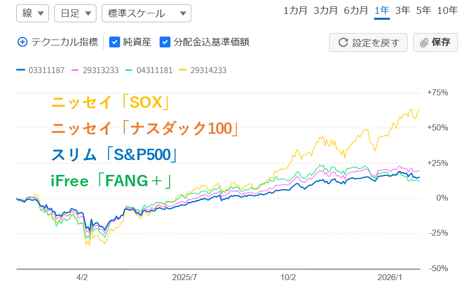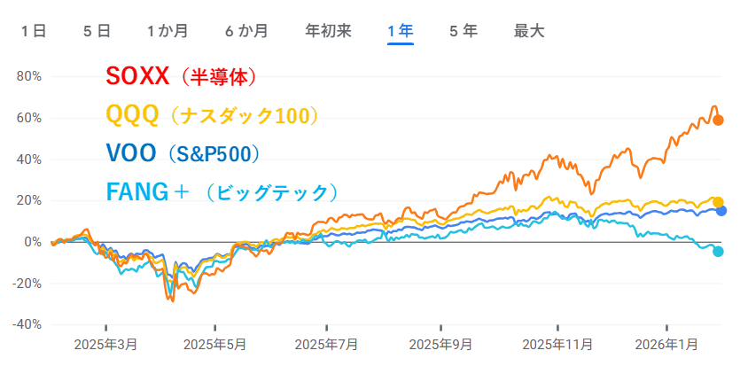 そこで「S&P500」「ナスダック100」を交えながら「ビッグテック(FANG+)」、「SOX」を比較して見ていきます
