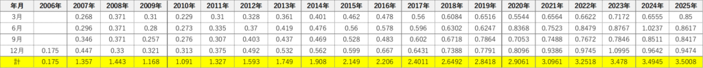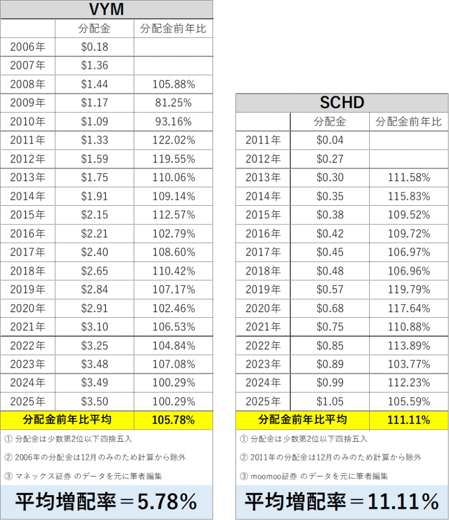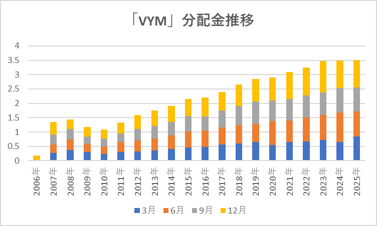 「VYM」も12~13年で、分配金が 2倍になるペースです