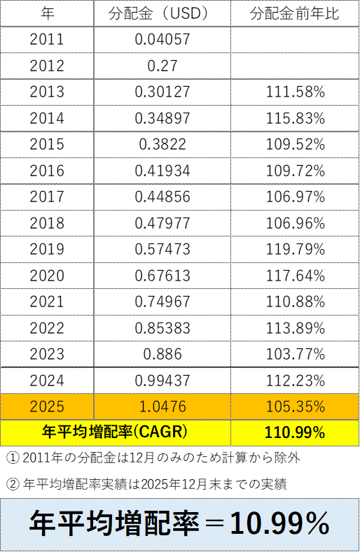 ① 「SCHD」の増配率は、設定来の年平均成長率(CAGR)を使う
