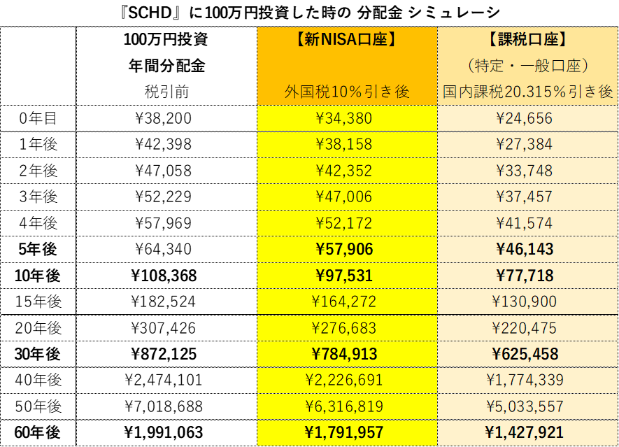 このシミュレーションの結果では、仮に、100万円「NISA口座」で「SCHD」に投資すれば