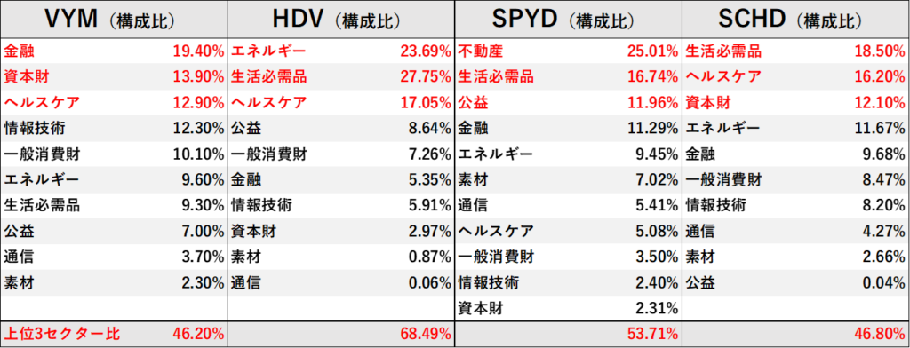 『HDV』と『SPYD』は、上位3セクターの 被りが少ないです傾向です